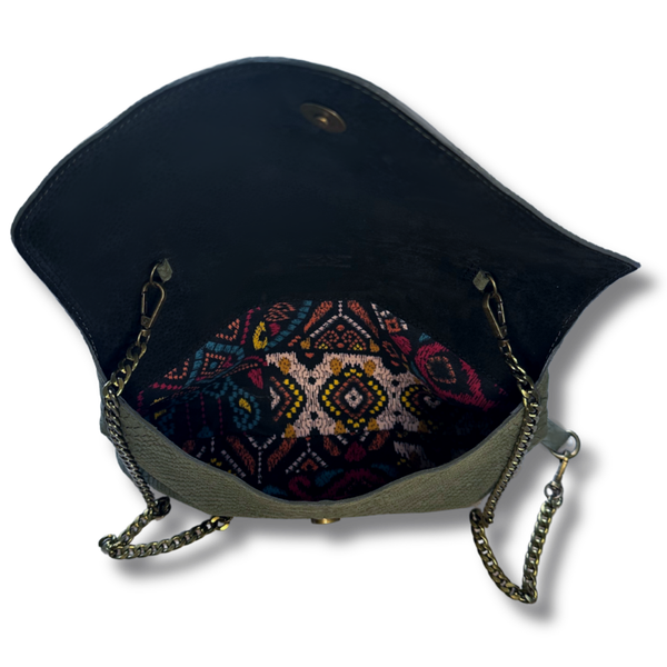 Découvrez le modèle Tristan, une pièce d’exception qui allie caractère et raffinement. Confectionné en cuir suédé embossé façon python vert kaki, il séduit par son jeu de matières sophistiqué et son allure audacieuse. se porte à l’épaule grâce à une bandoulière en cuir et chaîne dorée antique