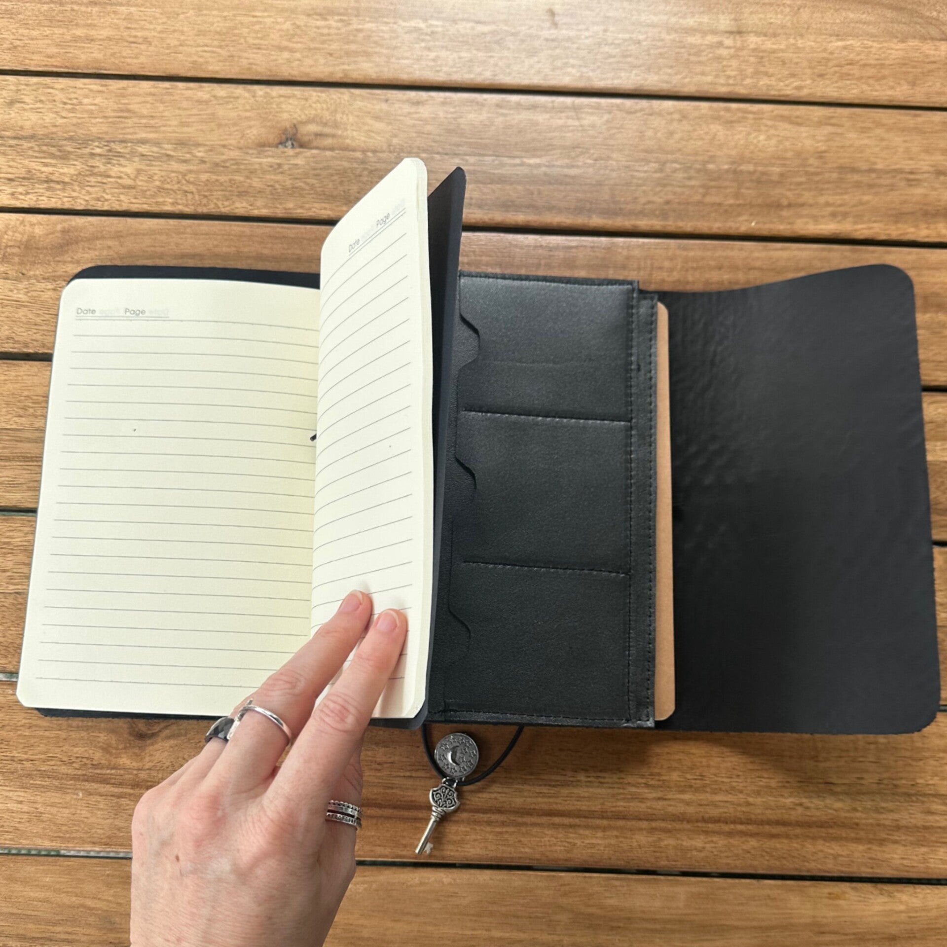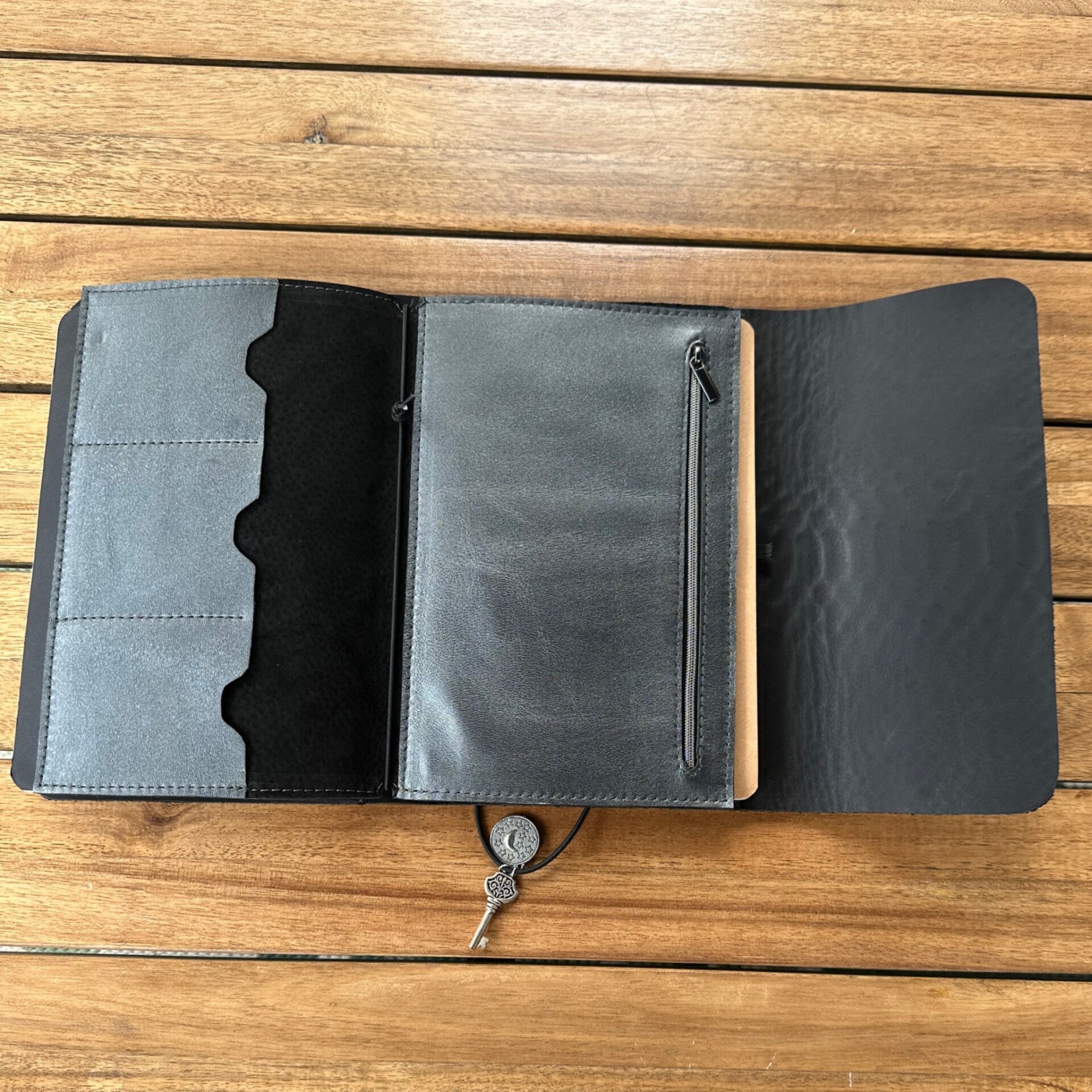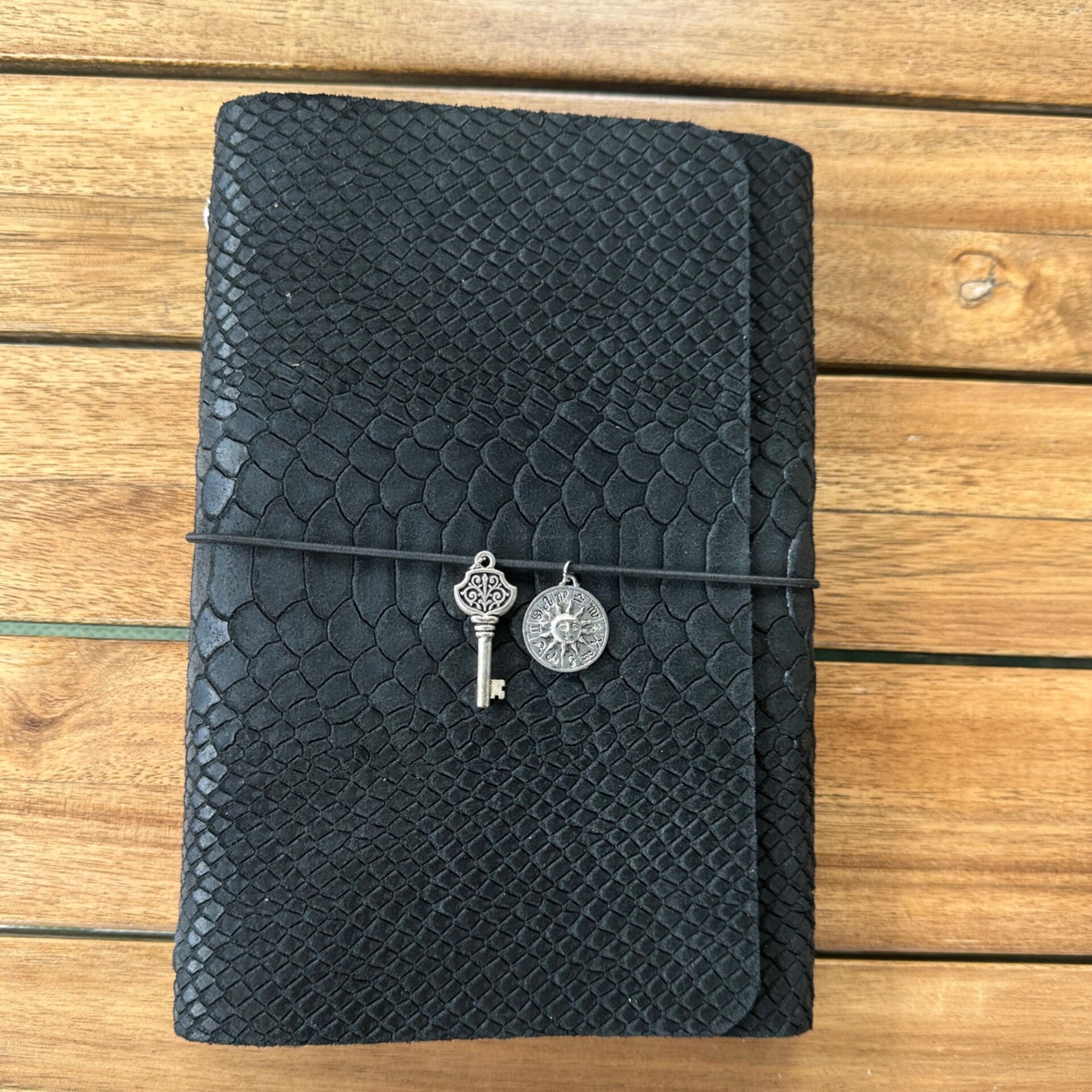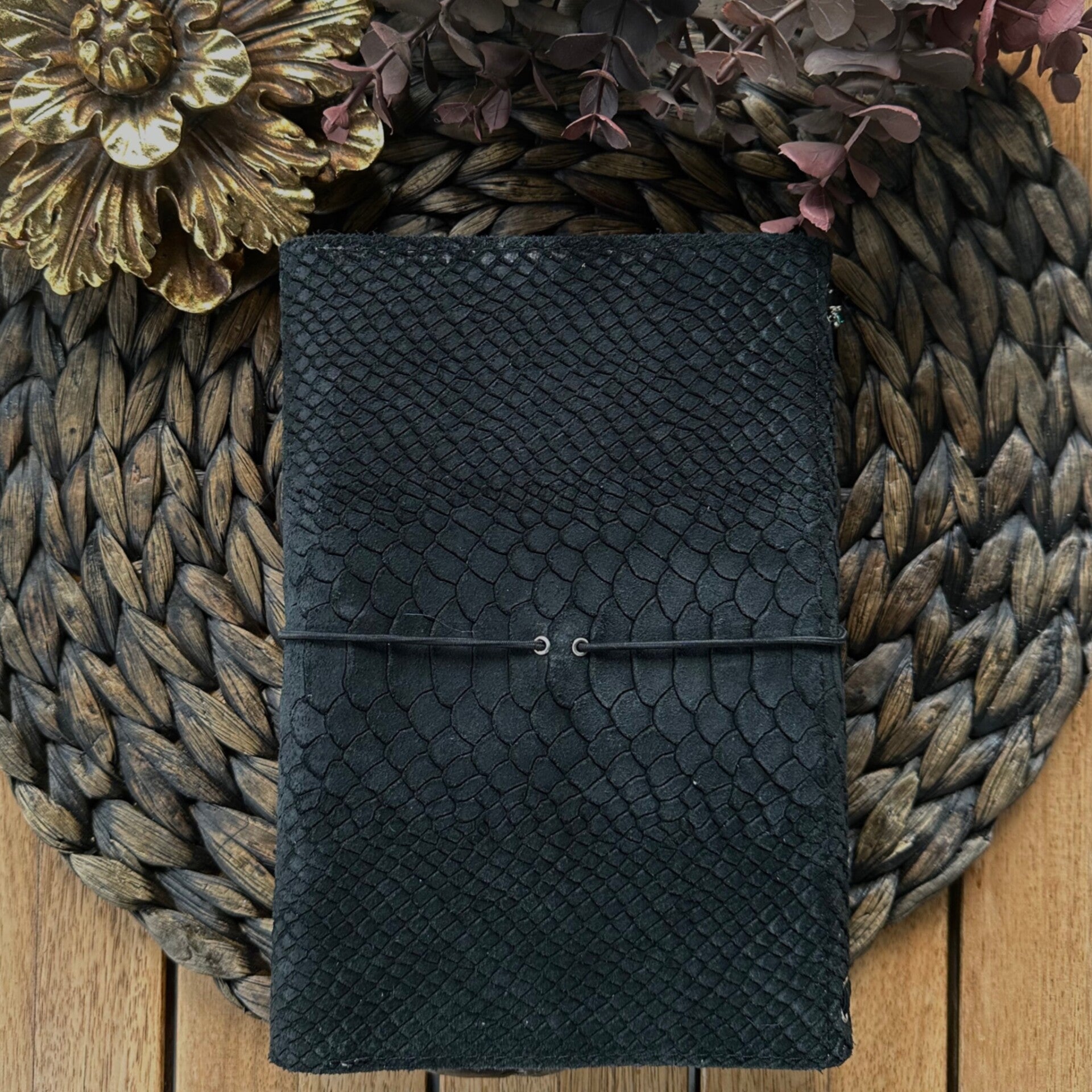 Réalisé à la main dans mon atelier, il est confectionné en cuir suédé embossé façon python, coloris noir et entièrement doublé de cuir. Son système d’élastiques permet d’ajouter ou de retirer facilement carnets et accessoires, selon vos besoins.