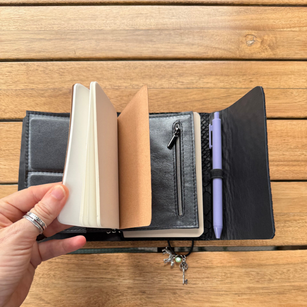 Rechargeable et modulable grâce à son système d’élastiques, ce petit carnet est idéal pour voyager léger, organiser ses idées ou glisser ses essentiels dans le sac du quotidien.