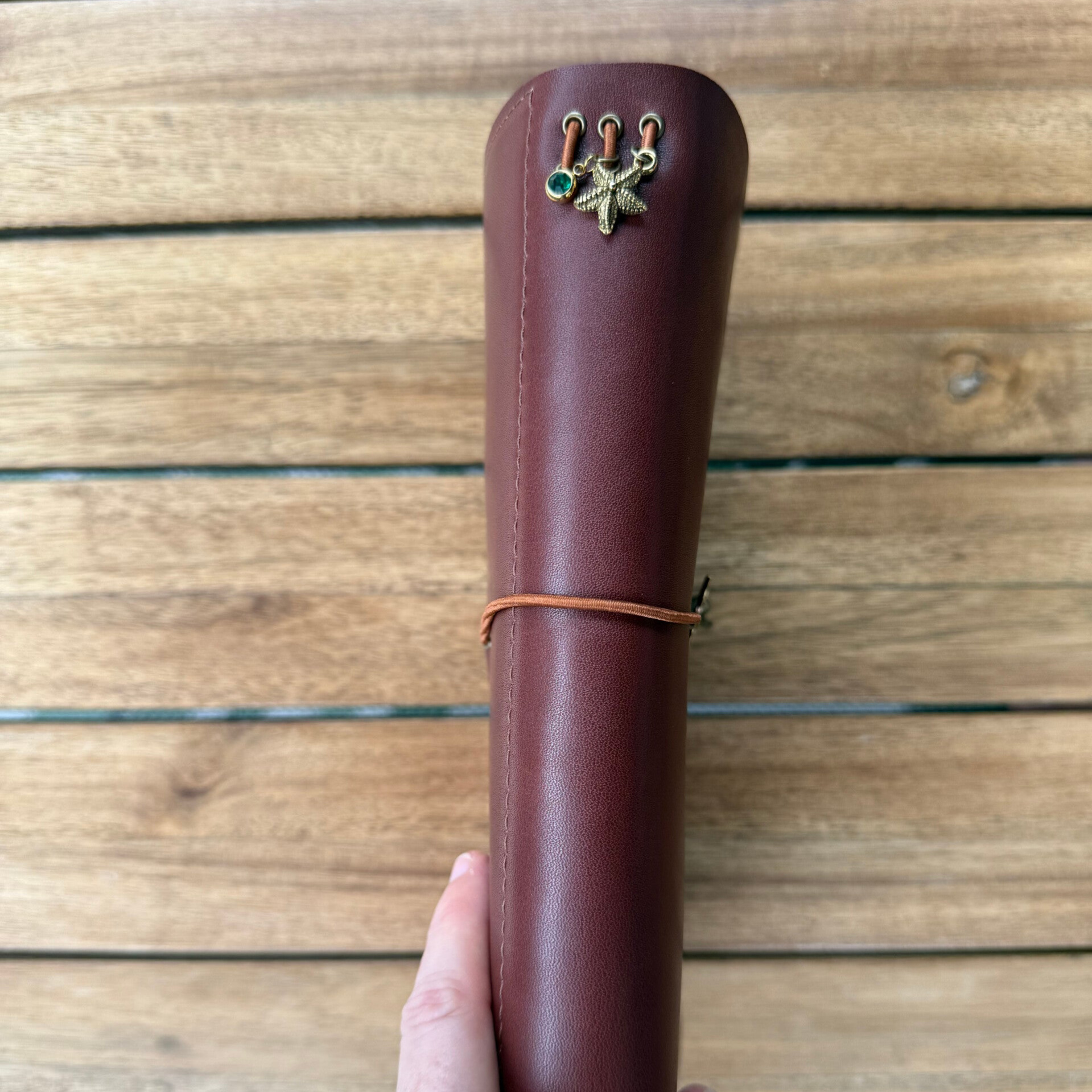 Réalisé à la main dans mon atelier, il est confectionné en cuir lisse, coloris acajou et entièrement doublé de cuir. Son système d’élastiques permet d’ajouter ou de retirer facilement carnets et accessoires, selon vos besoins.