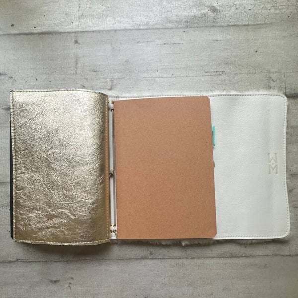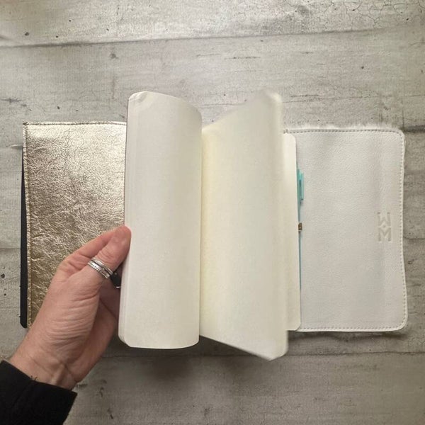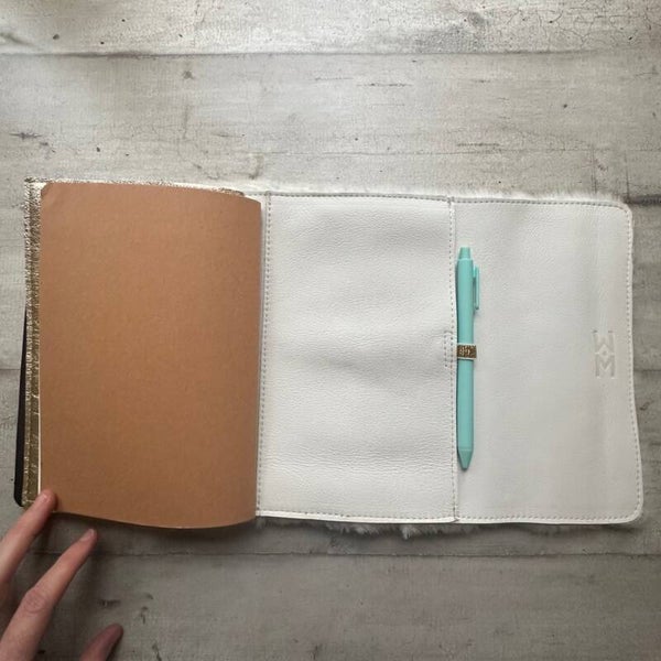Réalisé à la main dans mon atelier, il est confectionné en cuir lainé coloris créme et entièrement doublé de cuir. Son système d’élastiques permet d’ajouter ou de retirer facilement carnets et accessoires, selon vos besoins.