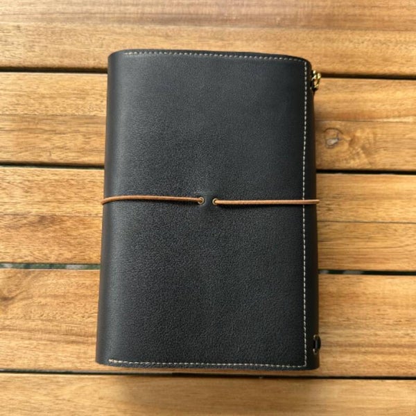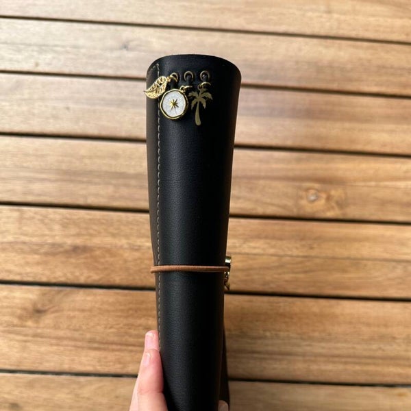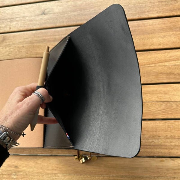 Réalisé à la main dans mon atelier, il est confectionné en cuir lisse, coloris noir et entièrement doublé de cuir. Son système d’élastiques permet d’ajouter ou de retirer facilement carnets et accessoires, selon vos besoins.