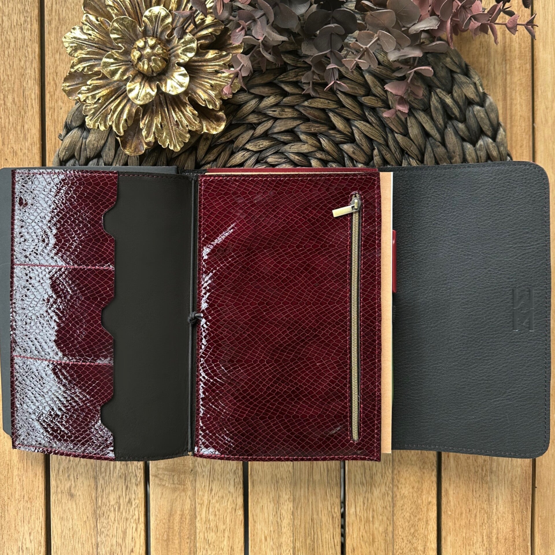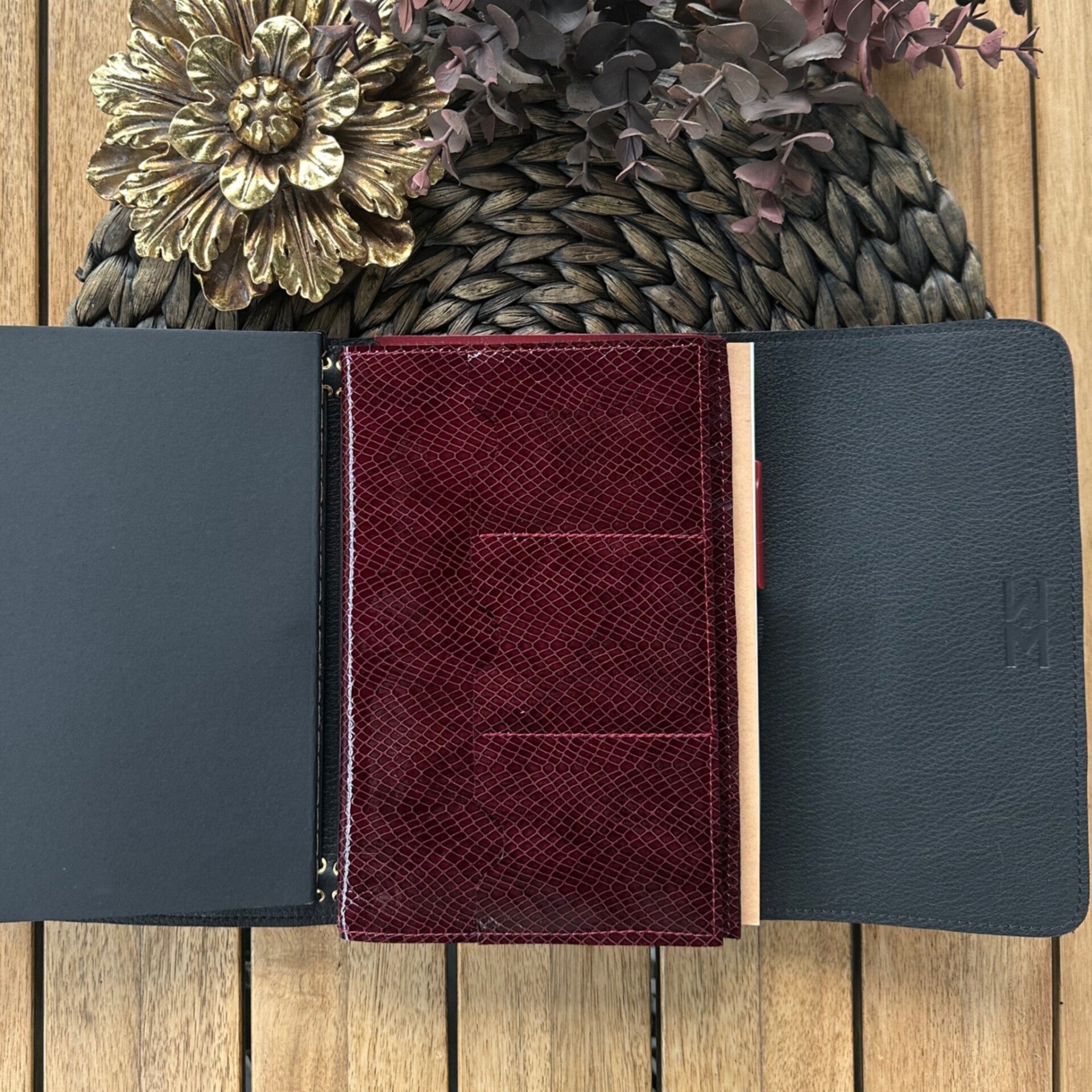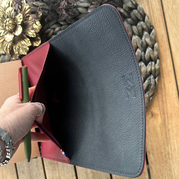 Réalisé à la main dans mon atelier, il est confectionné en cuir lisse, coloris bordeaux et entièrement doublé de cuir. Son système d’élastiques permet d’ajouter ou de retirer facilement carnets et accessoires, selon vos besoins.