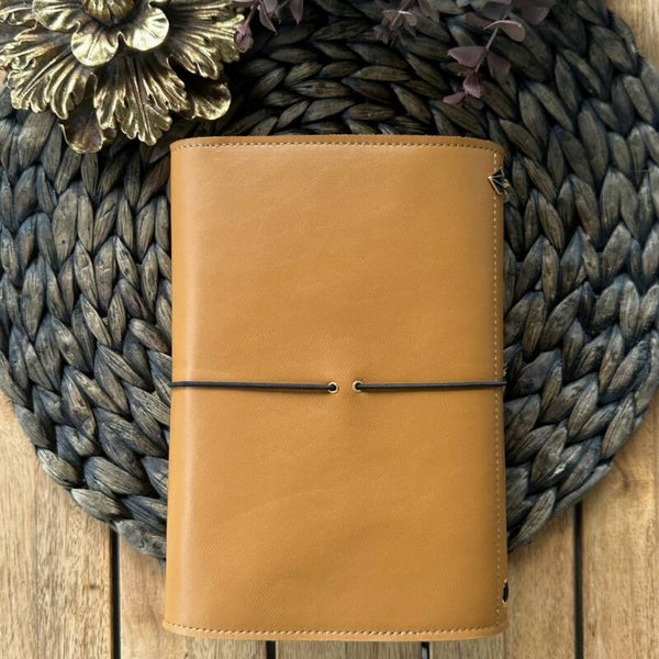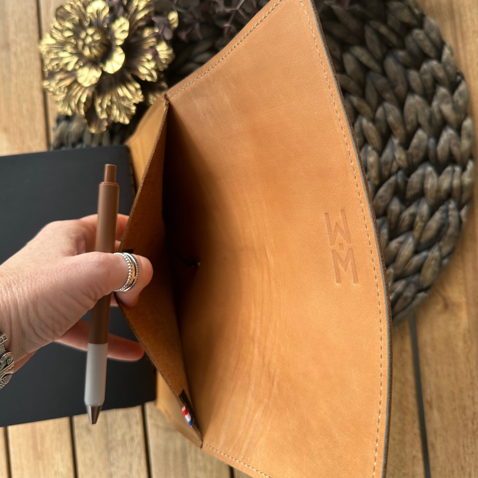 Réalisé à la main dans mon atelier, il est confectionné en cuir lisse, coloris camel et entièrement doublé de cuir. Son système d’élastiques permet d’ajouter ou de retirer facilement carnets et accessoires, selon vos besoins.