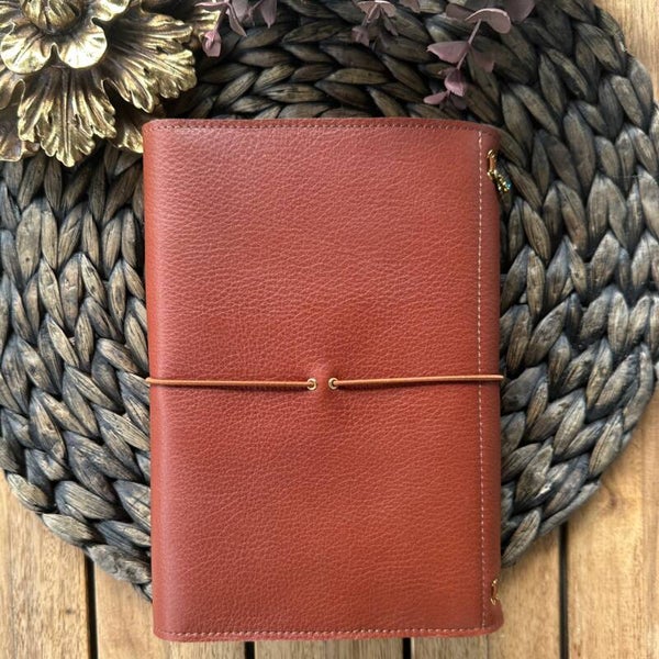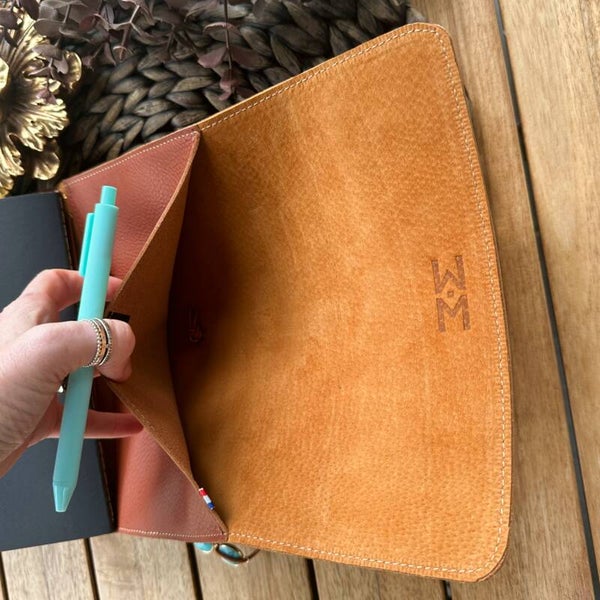 Réalisé à la main dans mon atelier, il est confectionné en cuir grainé, coloris cognac et entièrement doublé de cuir. Son système d’élastiques permet d’ajouter ou de retirer facilement carnets et accessoires, selon vos besoins.