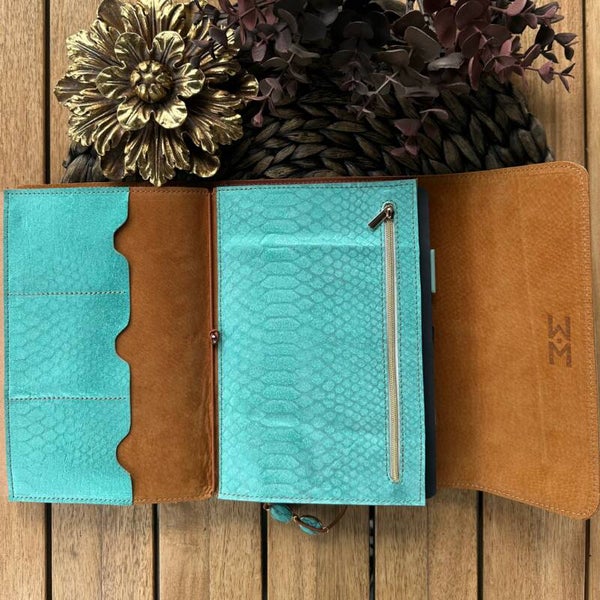 🔒 Une pochette zippée assortie en cuir imprimé python turquoise