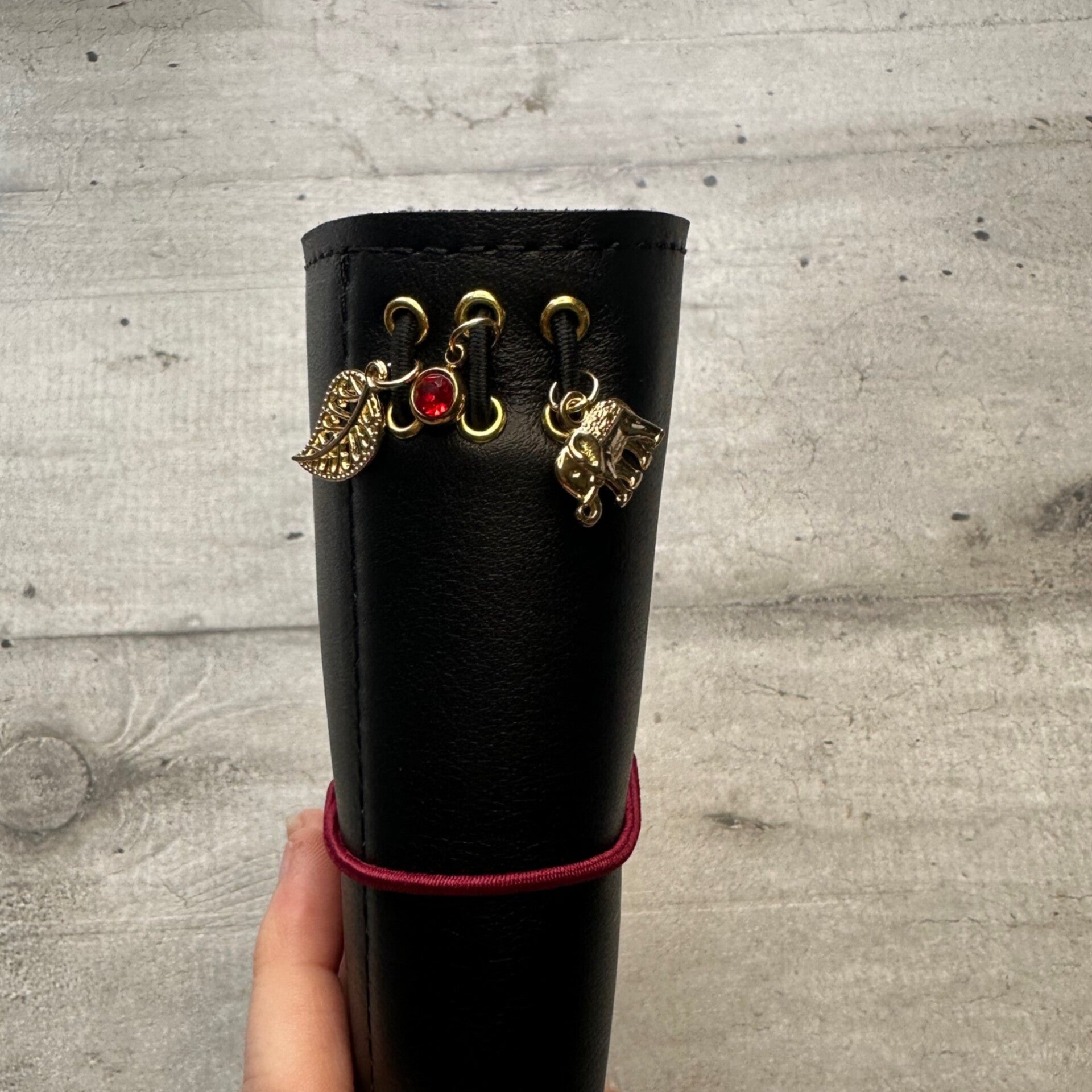 Réalisé artisanalement dans mon atelier, il est conçu en cuir lisse, coloris noir et entièrement doublé de cuir bordeaux. Il est organisé pour tout garder dans un petit espace :