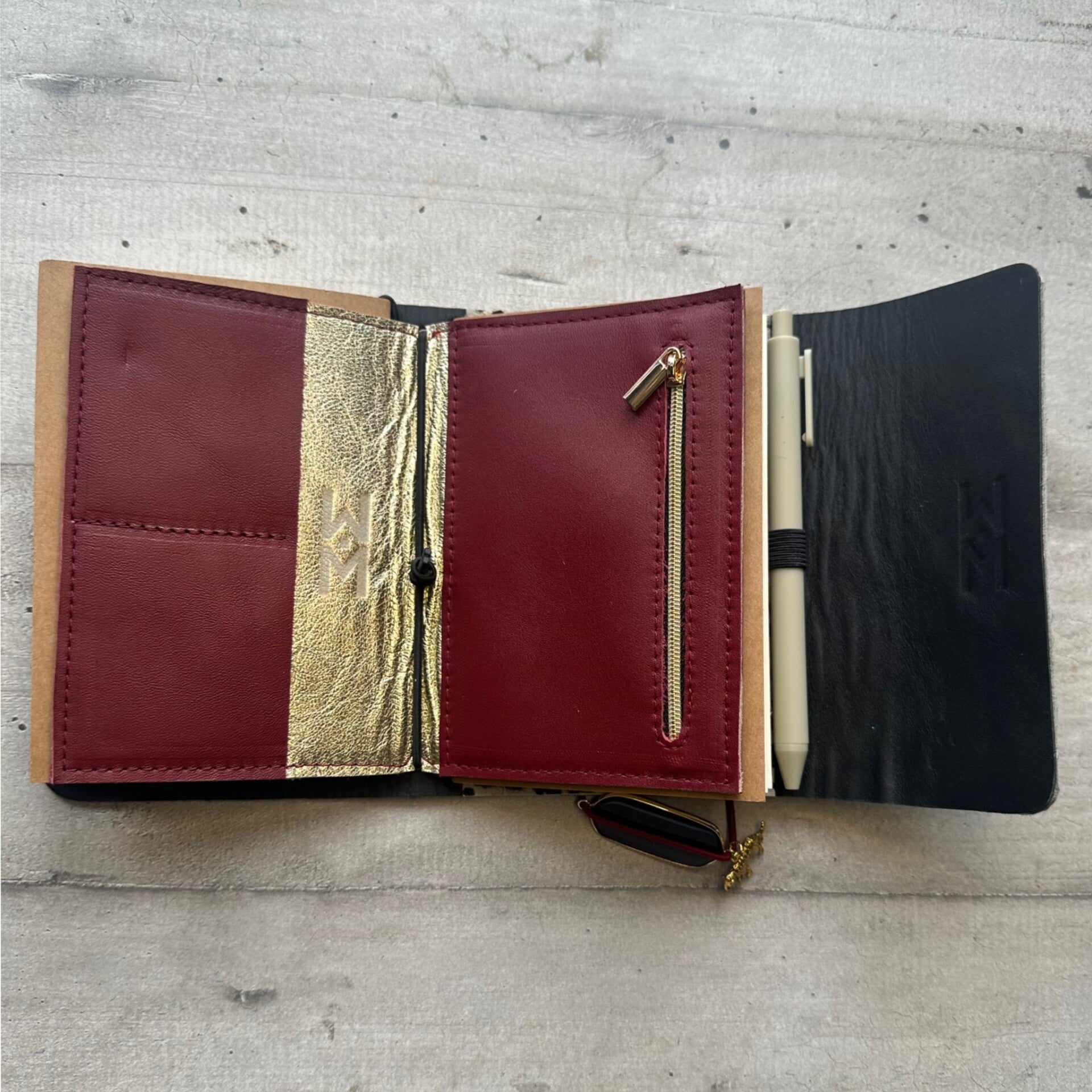 🔐 Une pochette zipper en cuir lisse bordeaux et doré