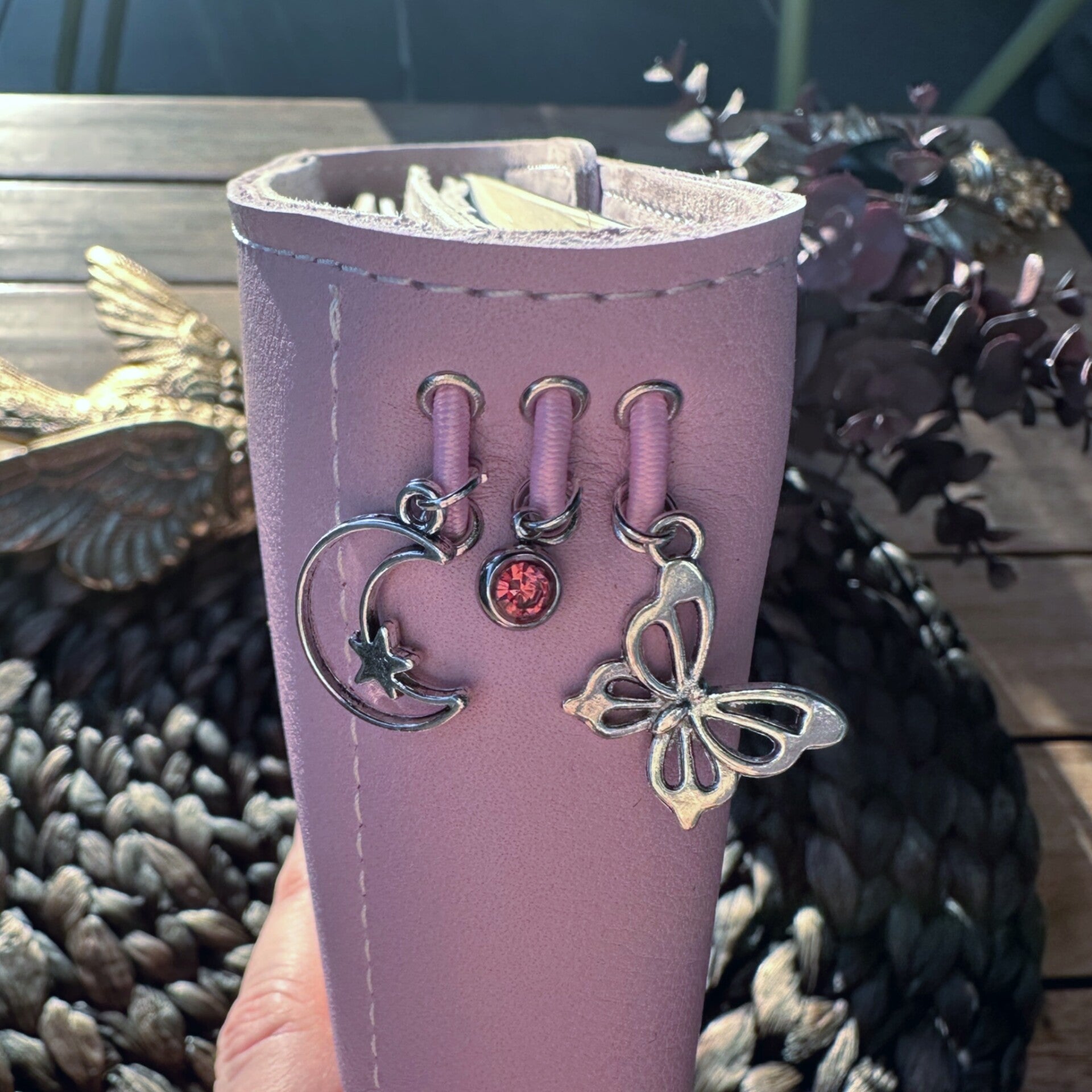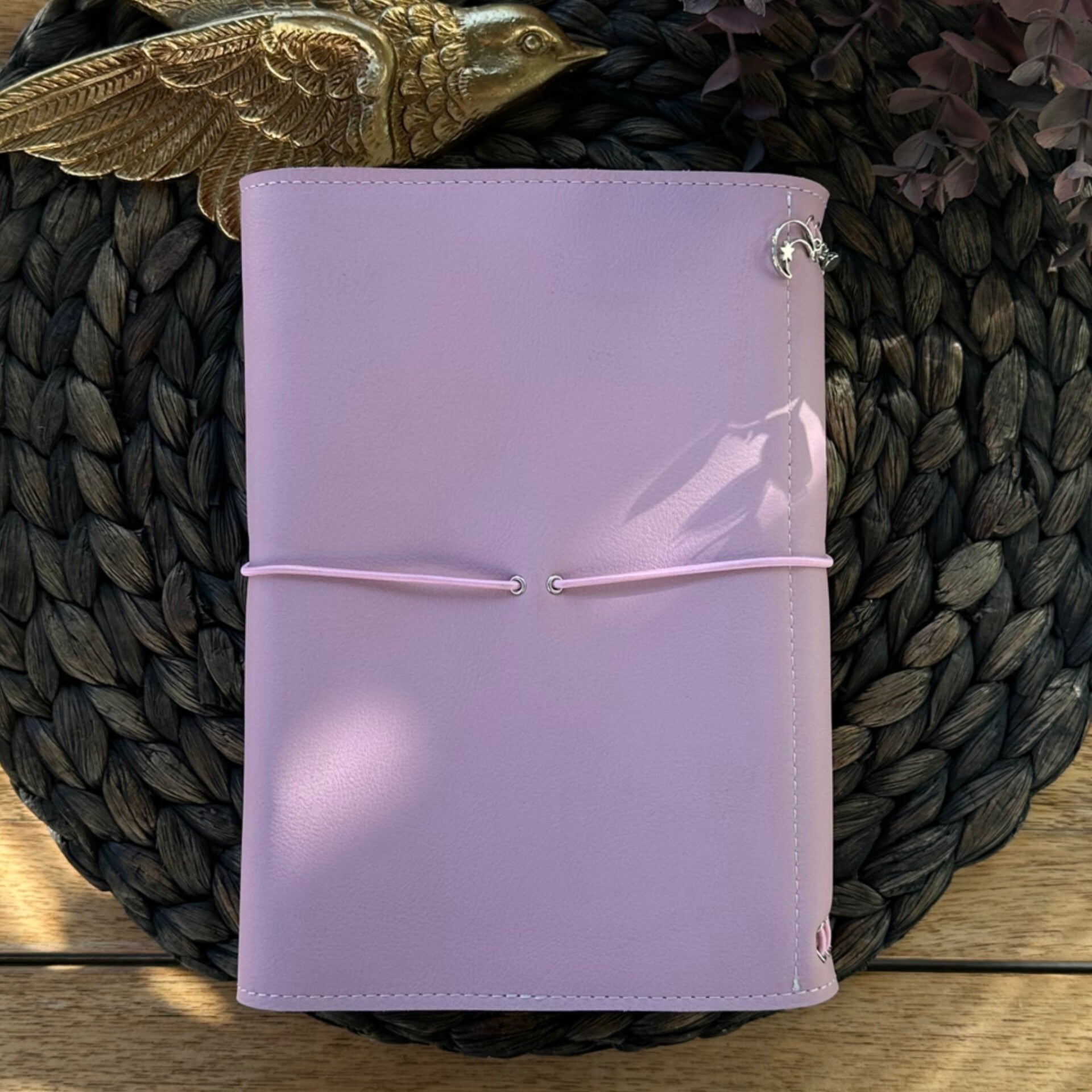 Réalisé à la main dans mon atelier, il est confectionné en cuir lisse, coloris mauve et entièrement doublé de cuir. Son système d’élastiques permet d’ajouter ou de retirer facilement carnets et accessoires, selon vos besoins.