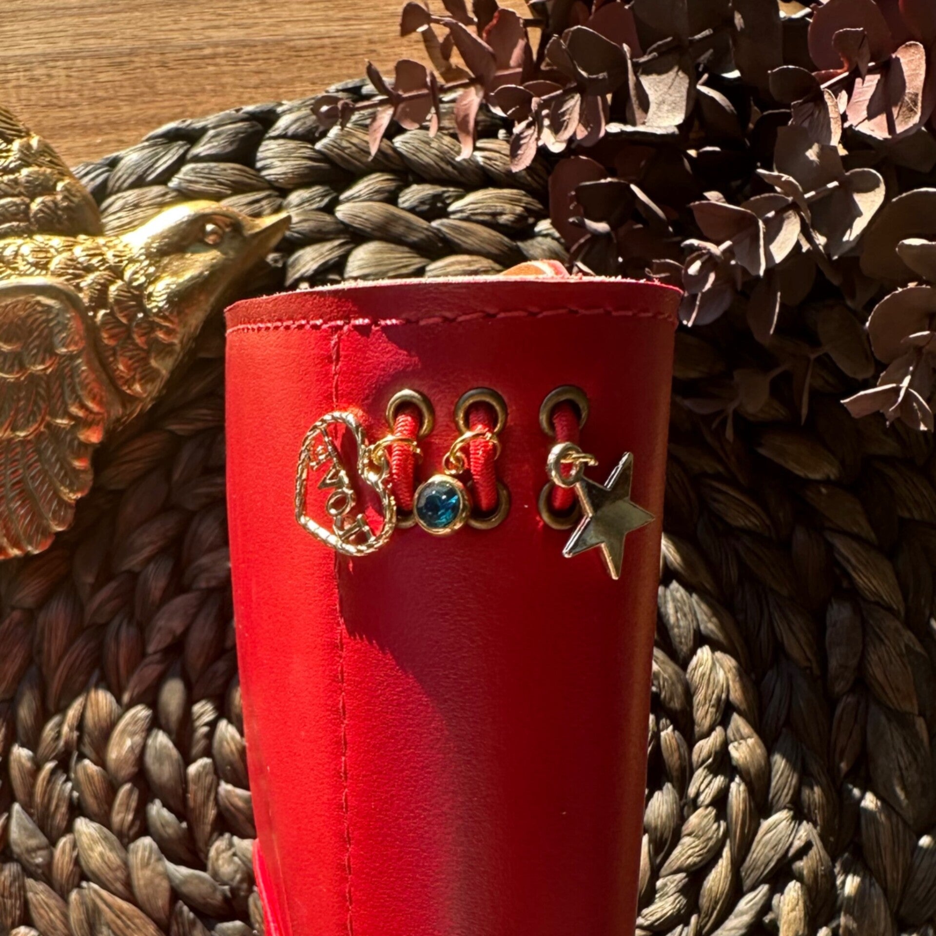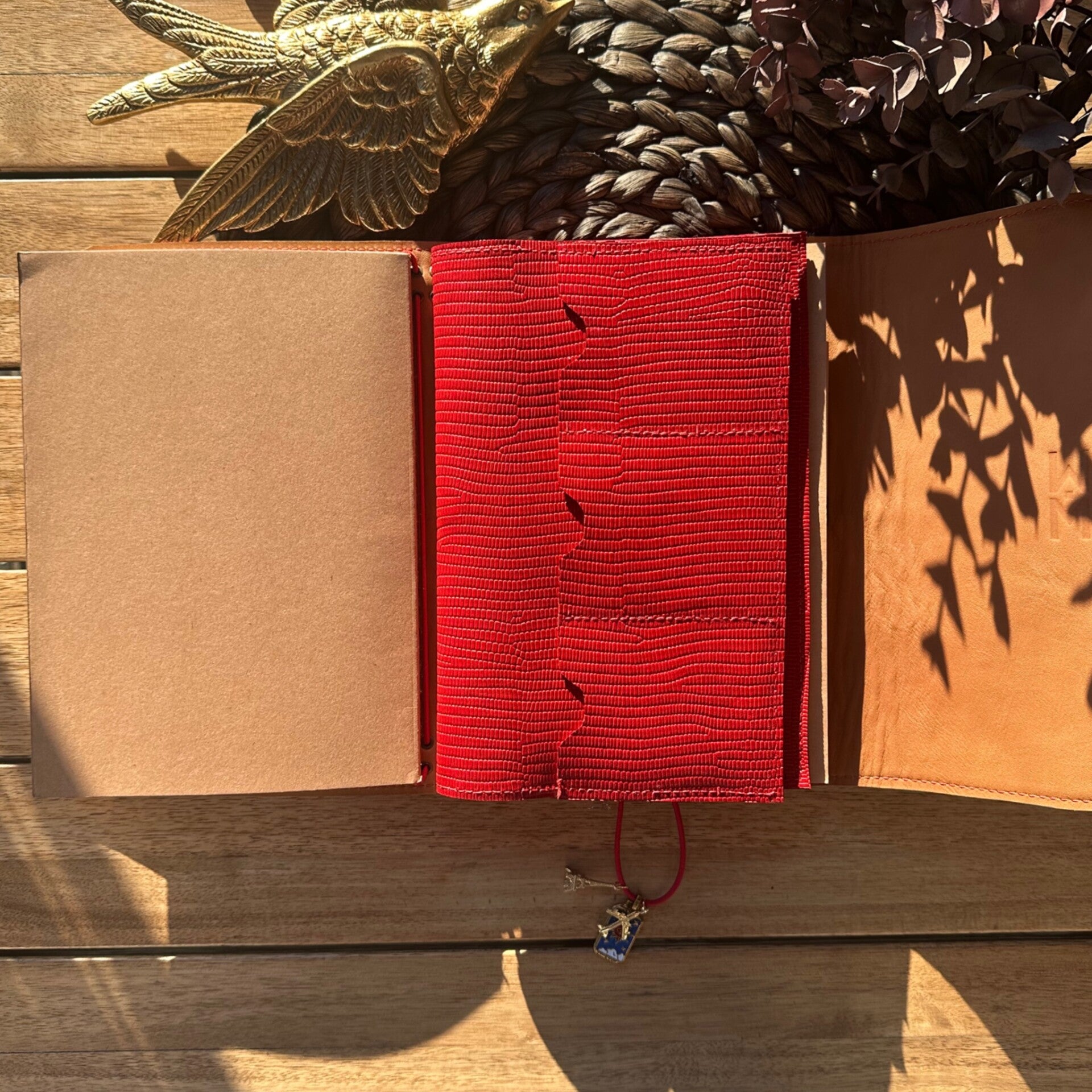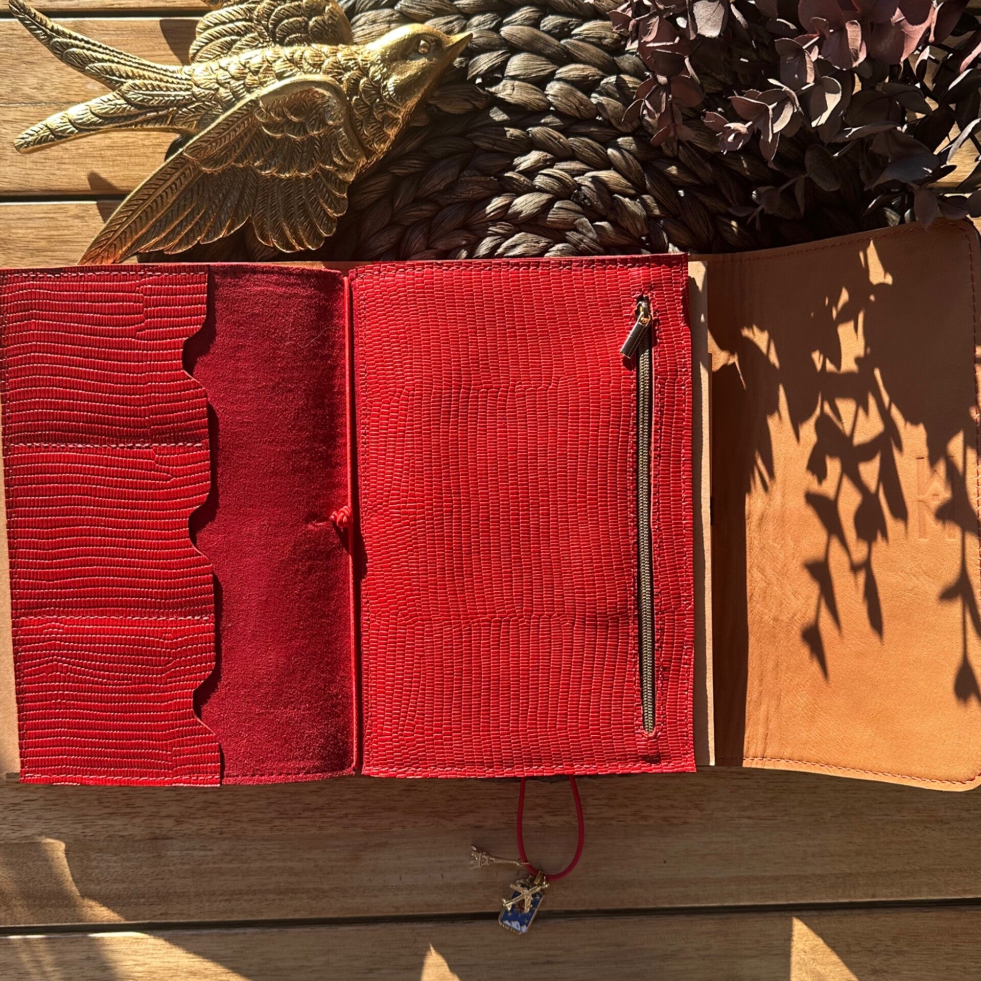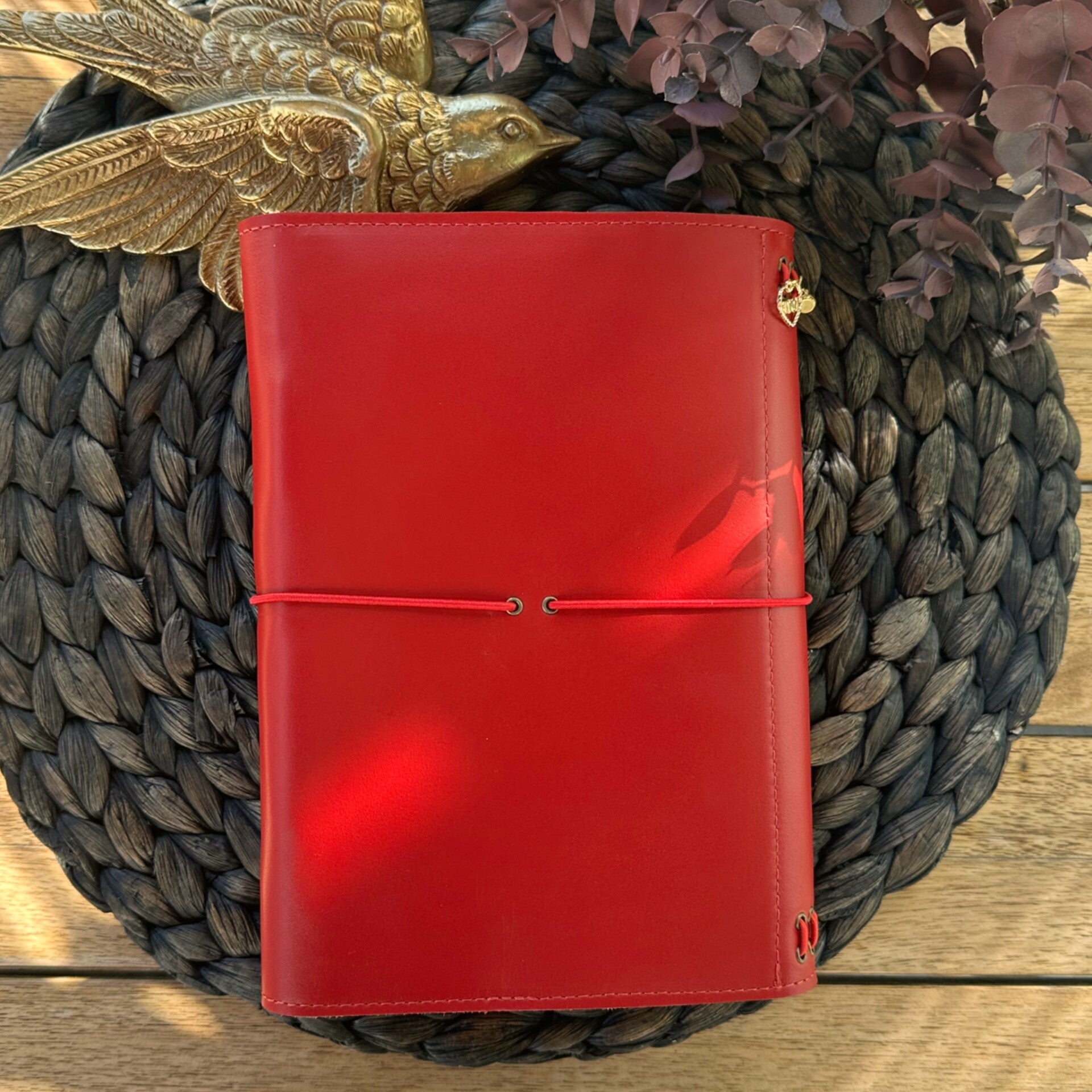 Réalisé à la main dans mon atelier, il est confectionné en cuir lisse, coloris rouge et entièrement doublé de cuir. Son système d’élastiques permet d’ajouter ou de retirer facilement carnets et accessoires, selon vos besoins.