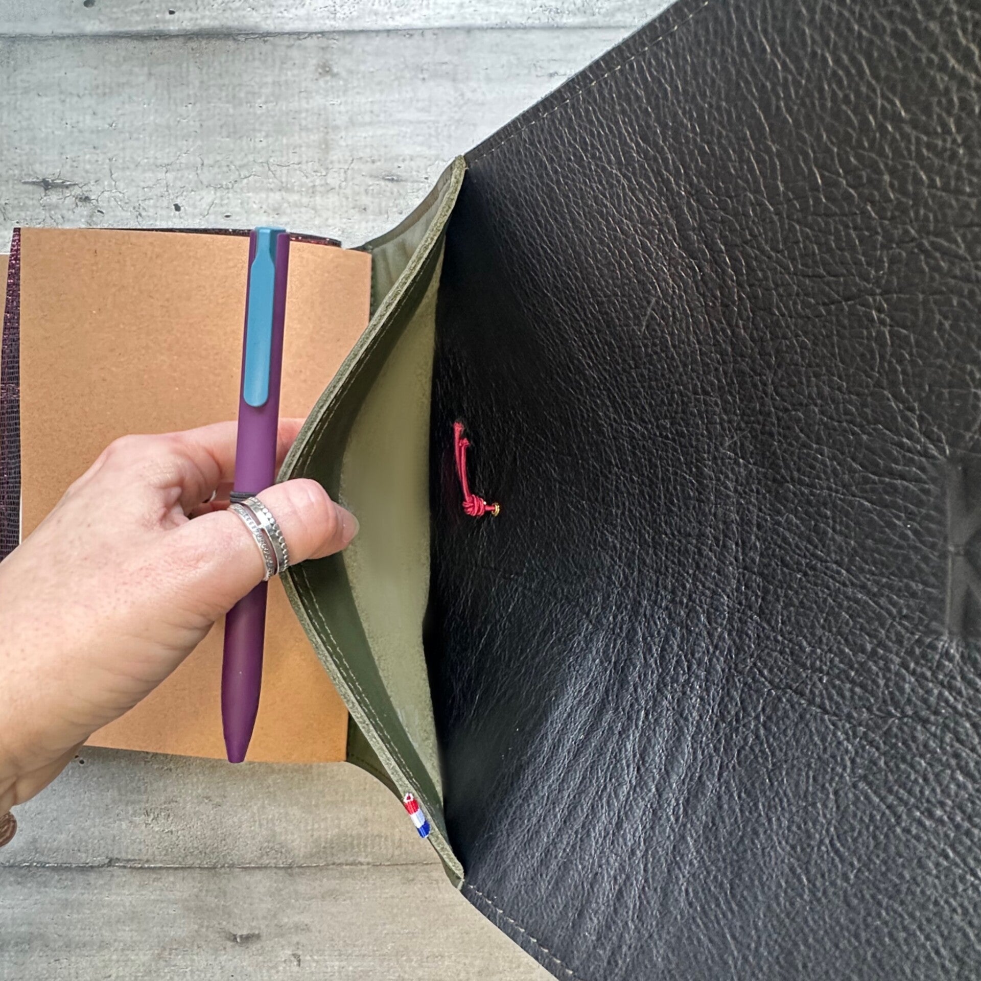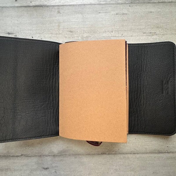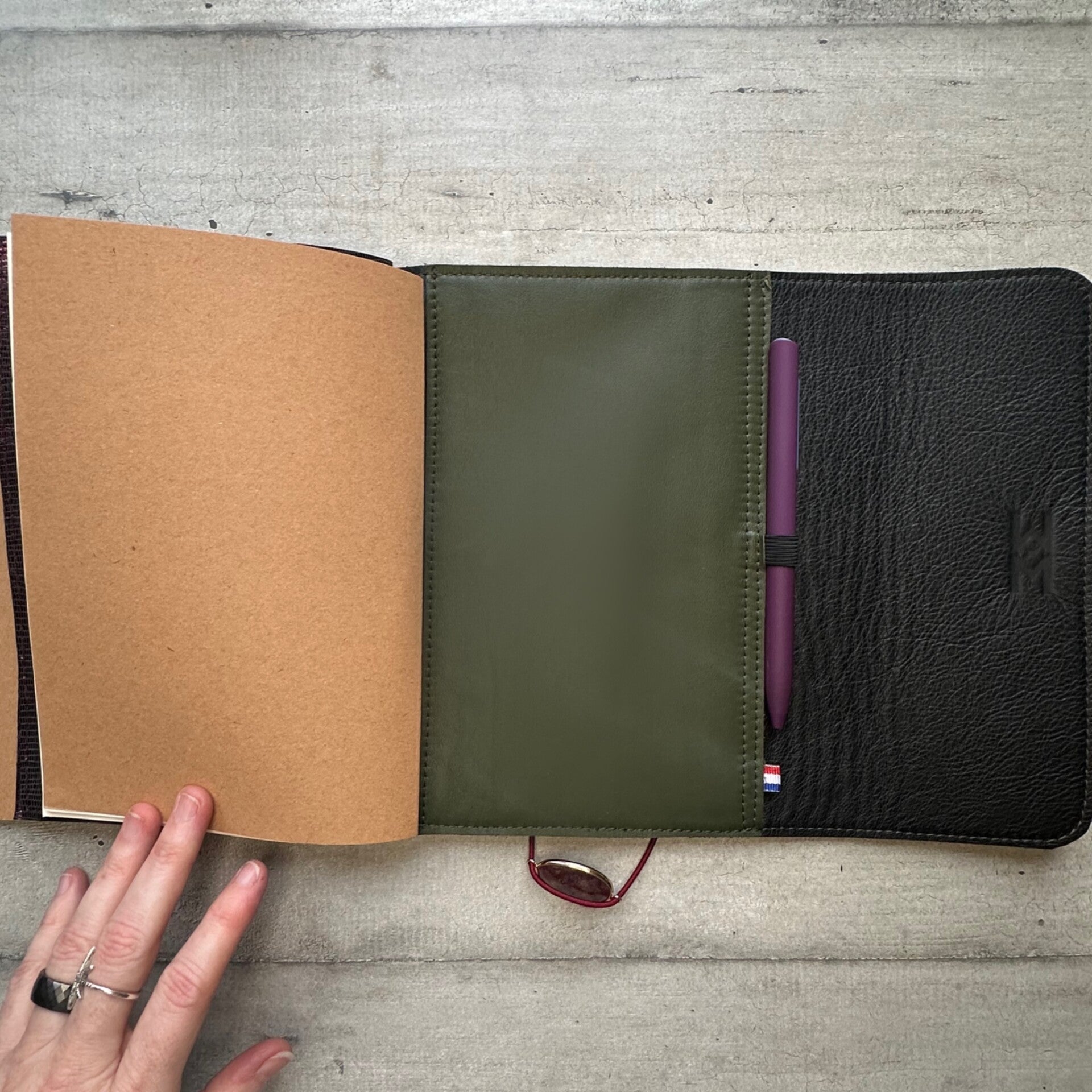 Réalisé à la main dans mon atelier, il est confectionné en cuir lisse, coloris kaki et entièrement doublé de cuir. Son système d’élastiques permet d’ajouter ou de retirer facilement carnets et accessoires, selon vos besoins.