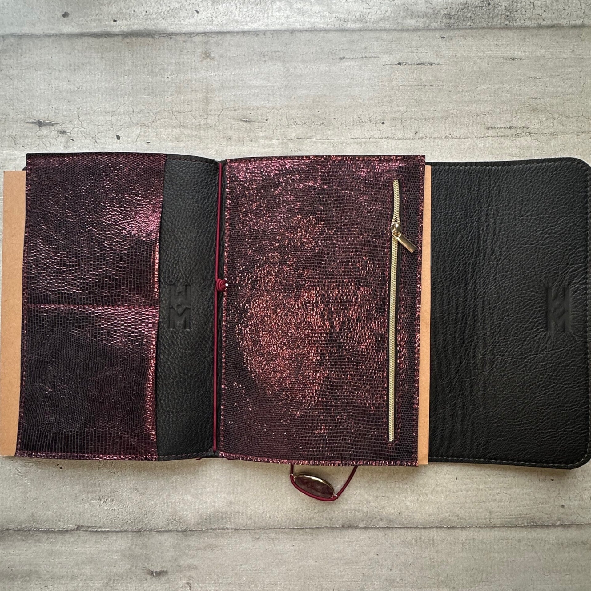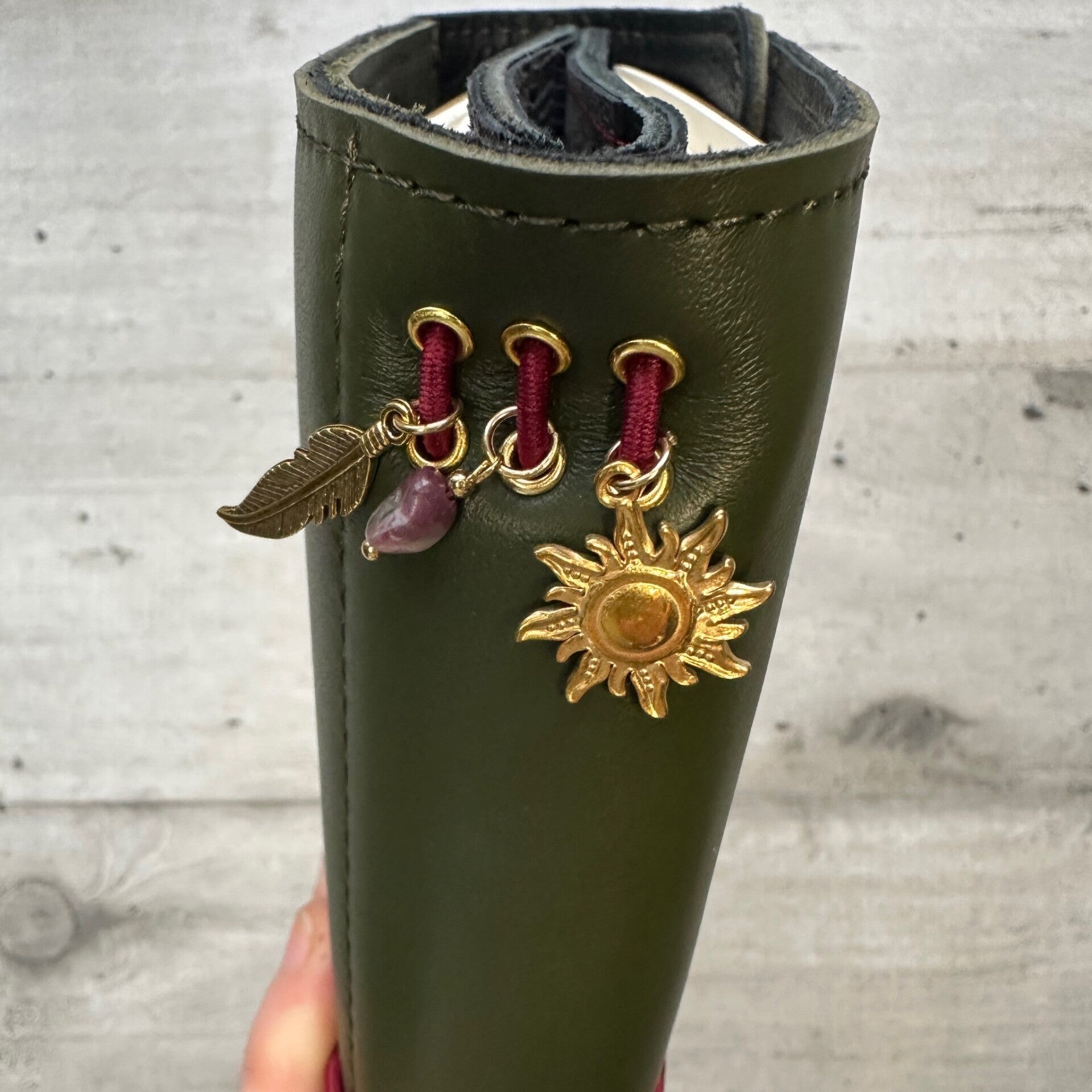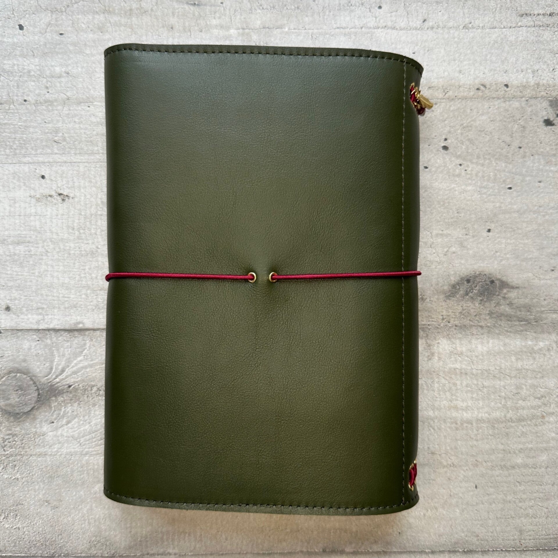 Réalisé à la main dans mon atelier, il est confectionné en cuir lisse, coloris kaki et entièrement doublé de cuir. Son système d’élastiques permet d’ajouter ou de retirer facilement carnets et accessoires, selon vos besoins.