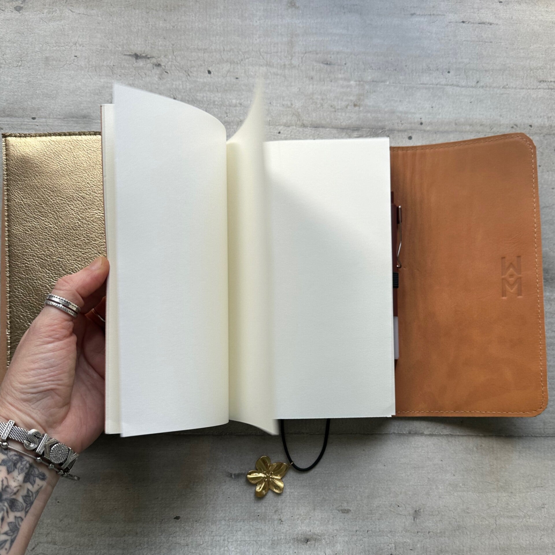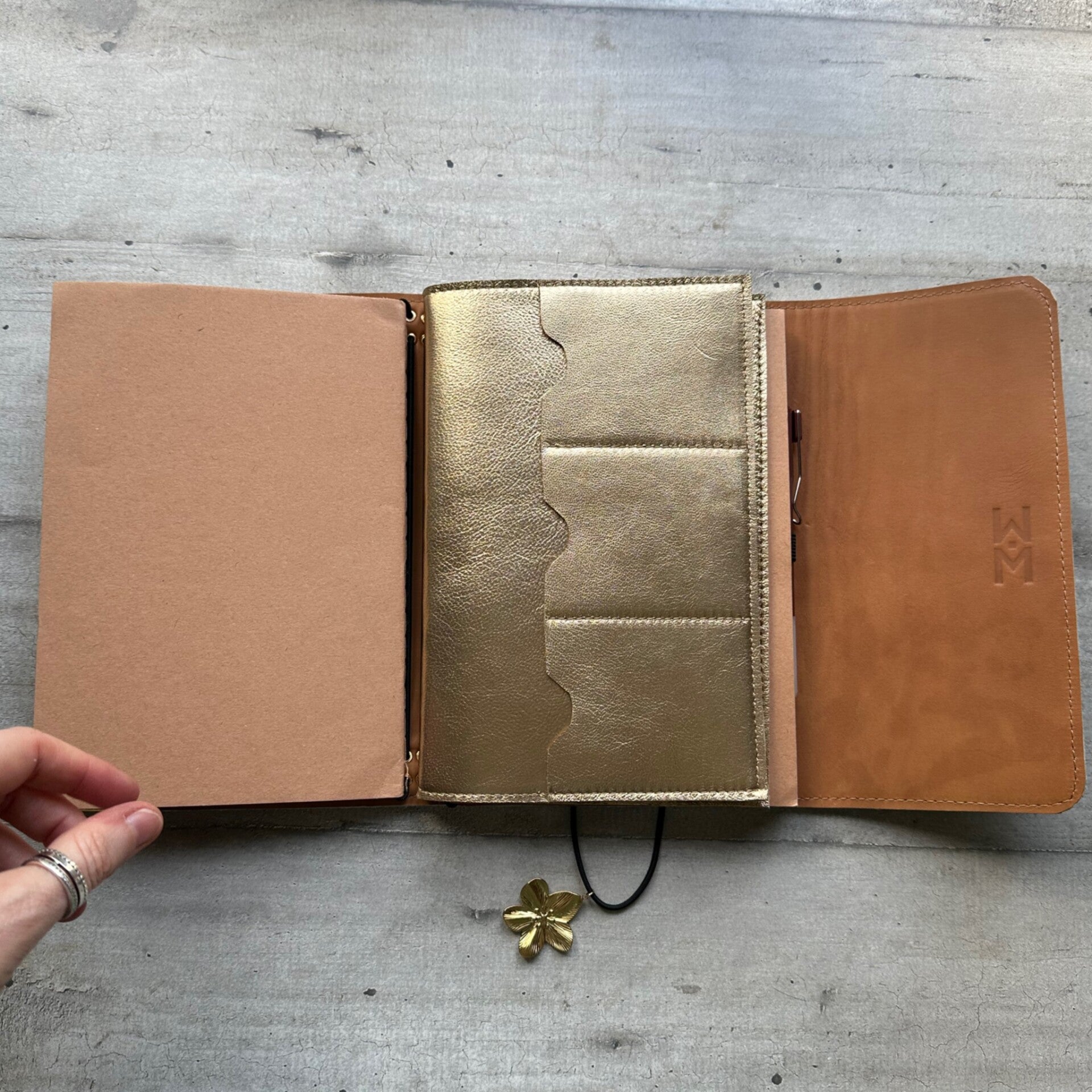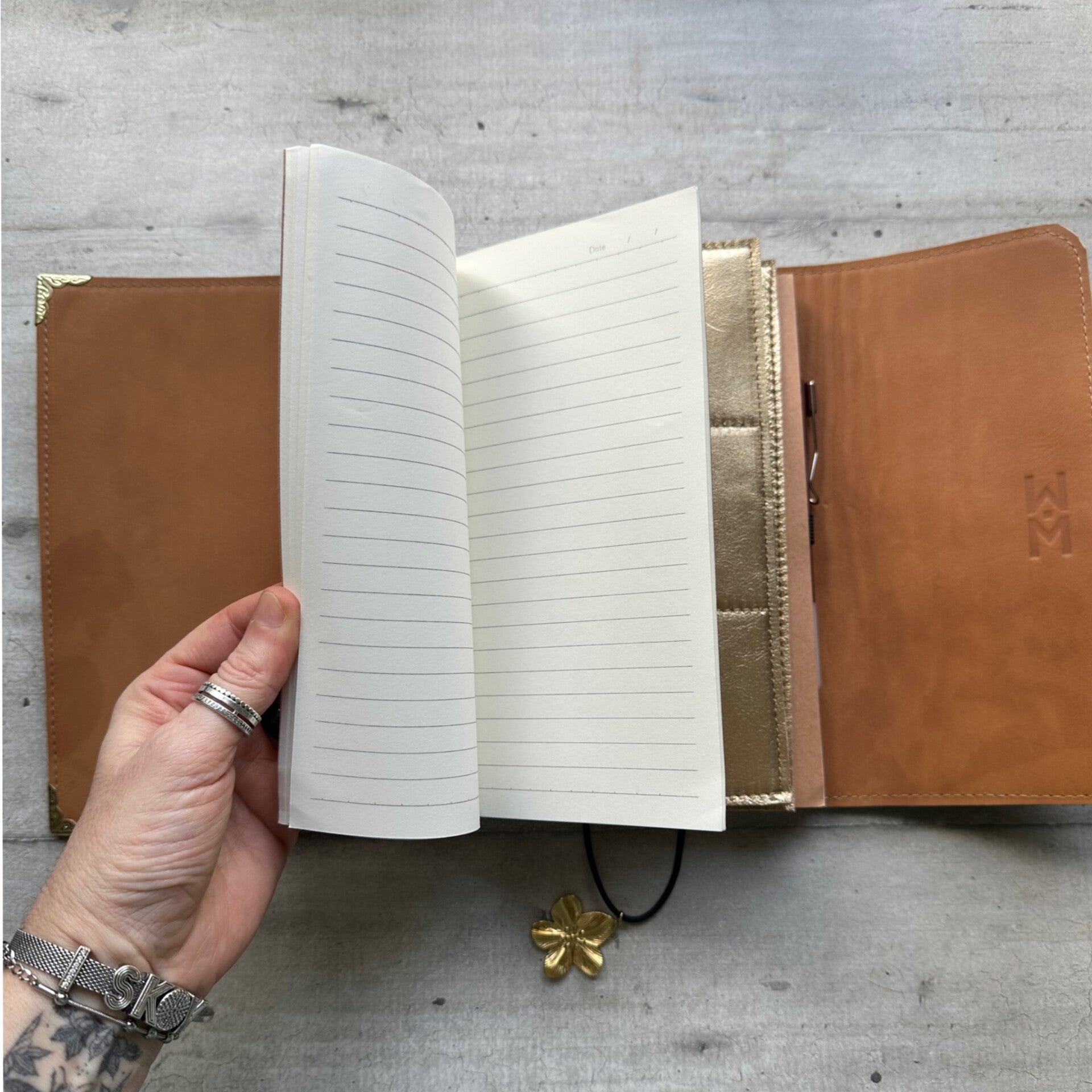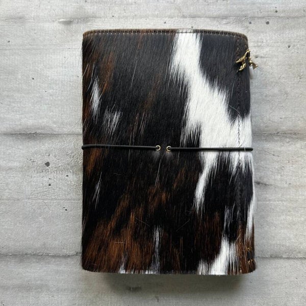 Réalisé à la main dans mon atelier, il est confectionné en cuir vachette poils, entièrement doublé de cuir. Son système d’élastiques permet d’ajouter ou de retirer facilement carnets et accessoires, selon vos besoins.