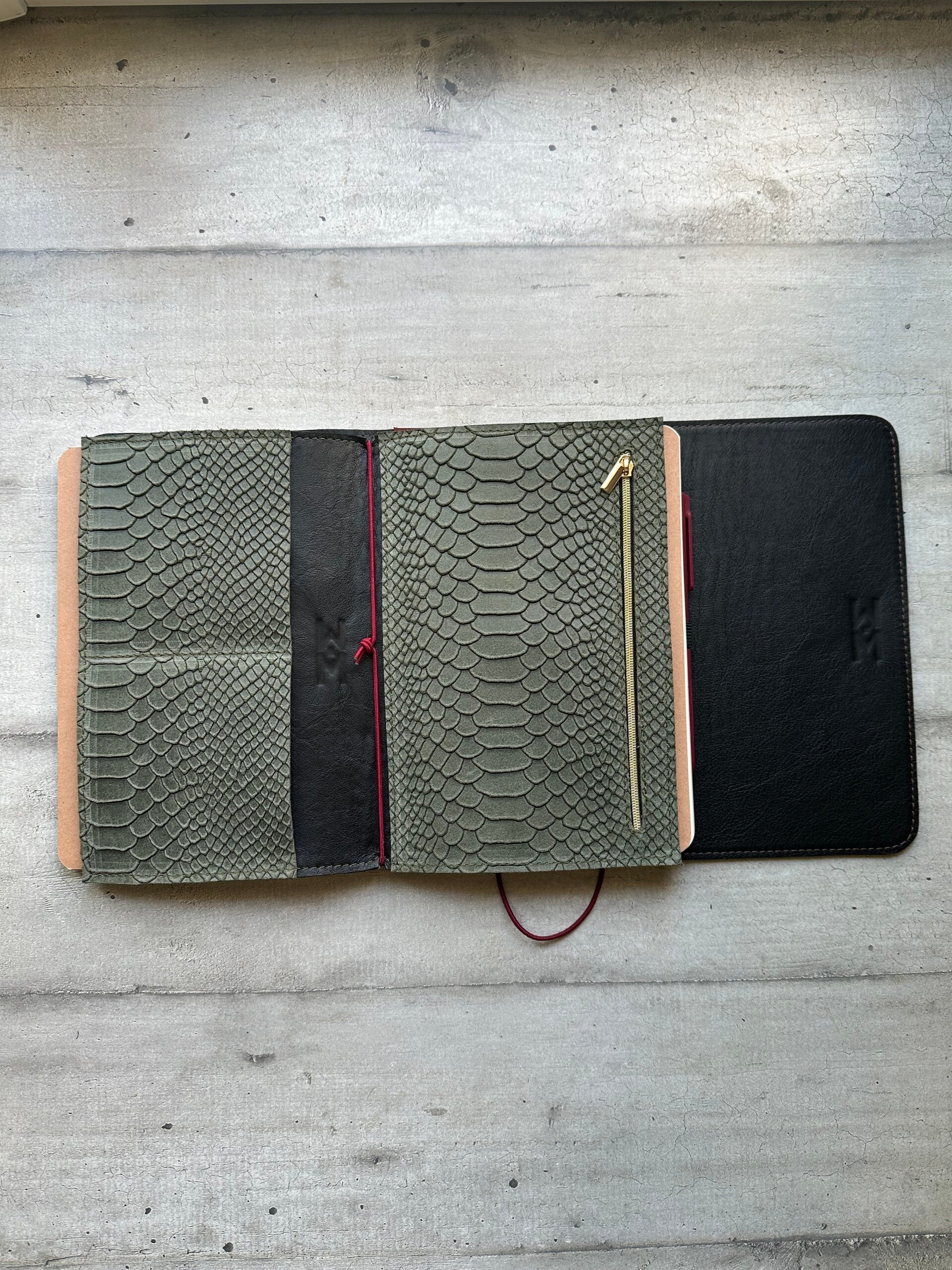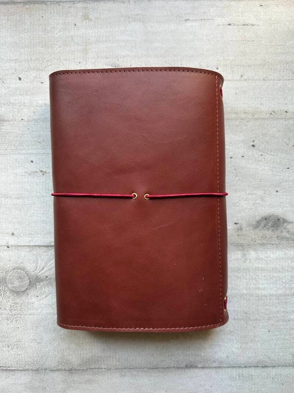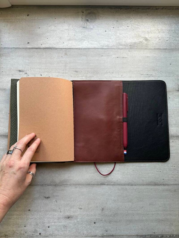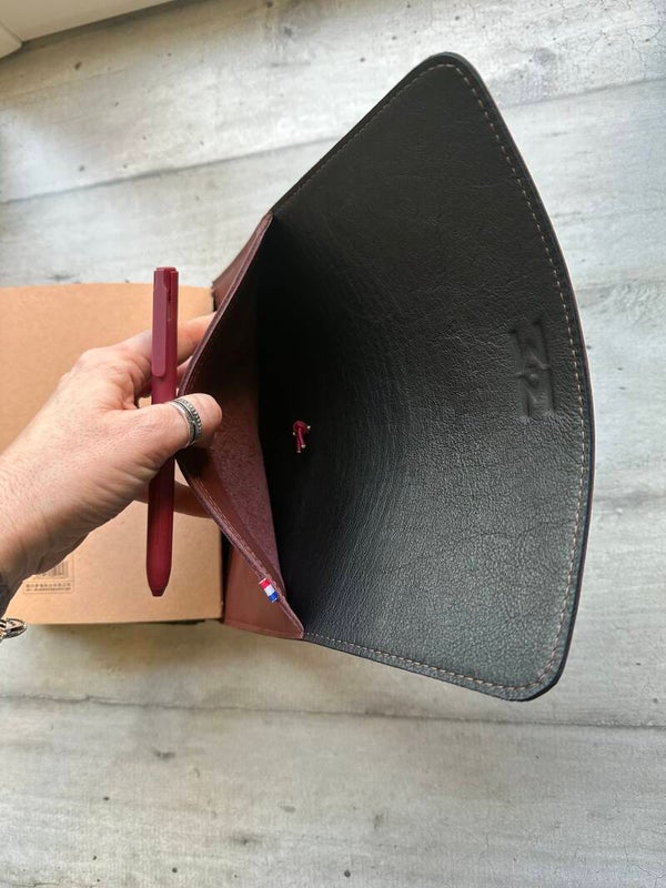 Réalisé à la main dans mon atelier, il est confectionné en cuir lisse, coloris châtaigne et entièrement doublé de cuir. Son système d’élastiques permet d’ajouter ou de retirer facilement carnets et accessoires, selon vos besoins.
